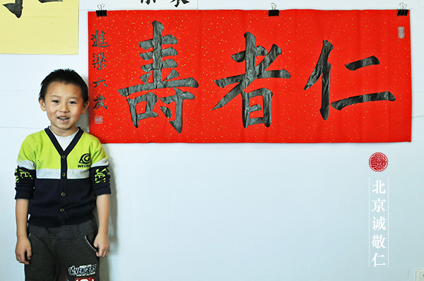 通過半年全天書法教室的學習,劉同學的進步是很顯著的,從寫筆畫的練習,直躍到字體的書寫,等到年節時已經可以在紅紙上寫作品了。今年回老家,直接在裁好的紅紙上寫「福」字。因為孩子年紀小,大人們聽說他寫「福」字,都饒有興致的來看。看到孩子擼起袖子鄭重其事寫字的樣子,真是又可笑又認真的場景。有大人說,先別說字寫的怎么樣,看他拿筆的架勢,好像就很會寫的勁頭哪。字寫出來確實很端正。