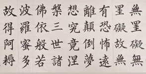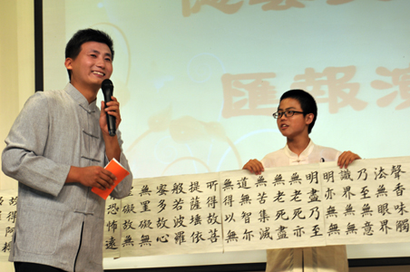 在這里更要提到的是來自湖南的常同學,雖然常同學今年才13歲,卻已經是多次來小院精進學習的老學員了。在楊淑芬老師的輔導下,常同學從基本筆畫到寫書法作品,到學習篆刻,乃至到如今揮毫寫下二百六十字的長幅書作《般若波羅蜜多心經》,