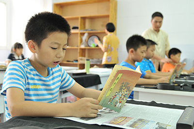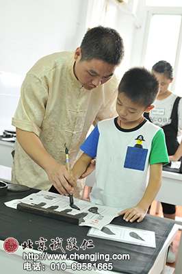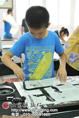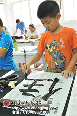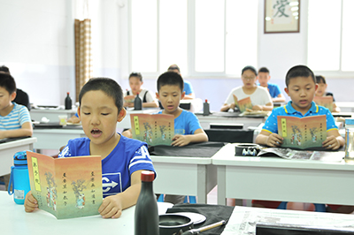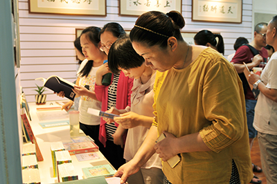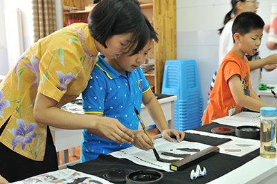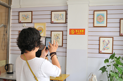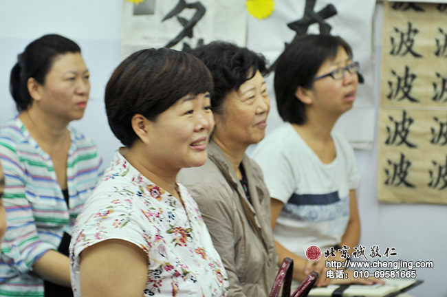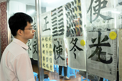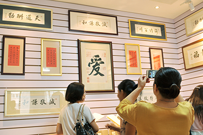 課余期間,學員們穿梭于教室之中,新奇的翻閱傳統文化產品,欣賞墻上一幅幅書法及彩繪作品。長廊兩側掛滿了書法學員的練習作業,記錄了他們快樂學習書法的成長歷程。