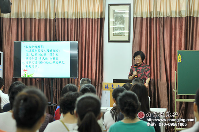老師以現代家庭教育、家庭主婦所應肩負的責任為起點,結合父親從小對自己言傳身教的深刻體會,從楊氏家族《四知堂》家訓以及遠古周朝「三太」母儀天下的家教風范,漸次展開,循序漸進地引導大家如何重視家庭教育,如何在生活日常中幫助孩子培養「溫、良、恭、儉、讓」的傳統美德。并列舉古代《孟母三遷》,及自己多年的教育事例,著重強調了環境教育的力量。