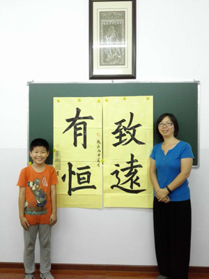 一轉眼,東東已經在「楊老師書法教室」學習書法十個月了,不光寫字有進步,性格也比以前安靜,謙虛,有耐心,待人也比以前友善了。德行的進步也是在楊老師書法教室學書法的收獲之一。今年暑假,楊老師書法教室在彰化路建立分部,剛好離我們家更近,上課也更便捷了。暑假鄭老師讓東東寫了兩幅作品「至善」和「有恒」,我想這也是老師對孩子的期望,希望東東能在書法道路上做好這兩點——精益求精,持之以恒。