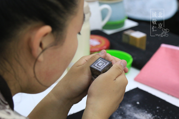 現(xiàn)場采用實物投影技術,一邊示范一邊詳細講解,方便同學們直觀了解要領,有疑問時可隨時抬頭觀看回放。 磨平印面:去除浮躁,磨平心性 學習步驟先從磨平印面開始,對于初學者來說,一方石頭六面都磨平也不是一件簡單的事情,在老師耐心指導與嚴格要求下,同學們耐住性子,在磨石中慢慢磨平了心性,對力道的掌控也有了精準敏感度,在反復觀察印面是否方正的過程中也不斷提升著精準的眼力。