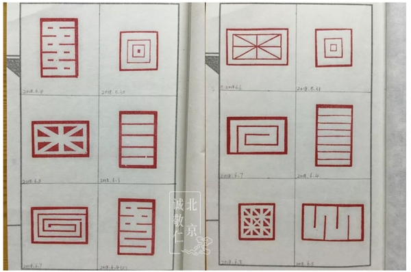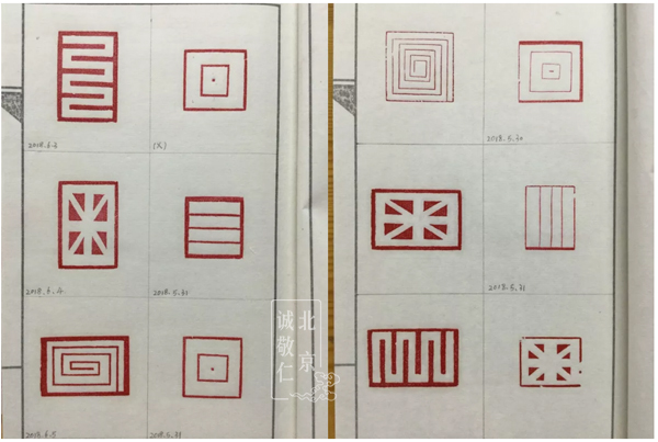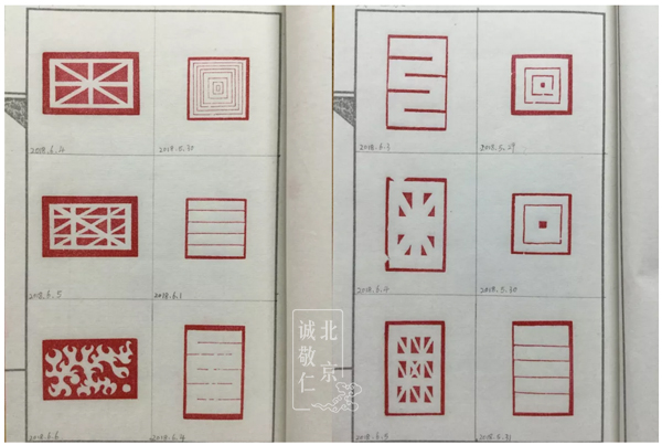 作業(yè)印譜本上滿滿的印章,記錄著大家認真的付出。 嚴格要求初學者至少完成六方形狀各異的直線圖案,經(jīng)老師檢查過關后方可進入下一關。
