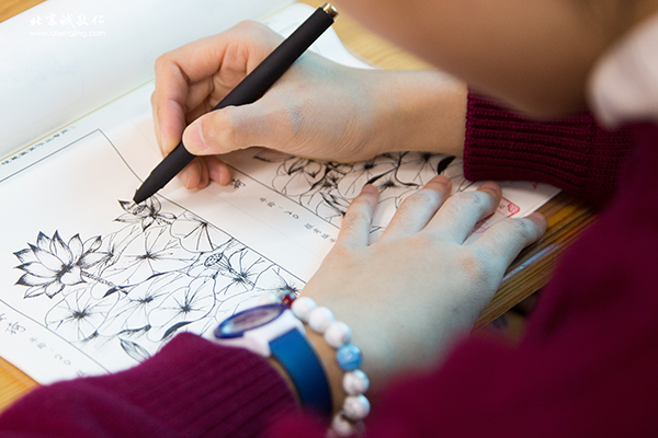 還有給我印象很深的《硬筆國畫》,第一次上硬筆國畫課,第一個內容是畫圓,我心想:時間這么寶貴,為什么要畫圓圈呢?可是畫了之后才體會到其中的深意。 因為畫的時候必須要慢,要專注,不然肯定是畫不圓的,一個圓畫完還想畫第二個,一個不圓,下一個就想畫圓,就這樣一直畫下去,漸漸地心無旁騖,平心靜氣,才理解老師的方法都是教我們練靜定的功夫。