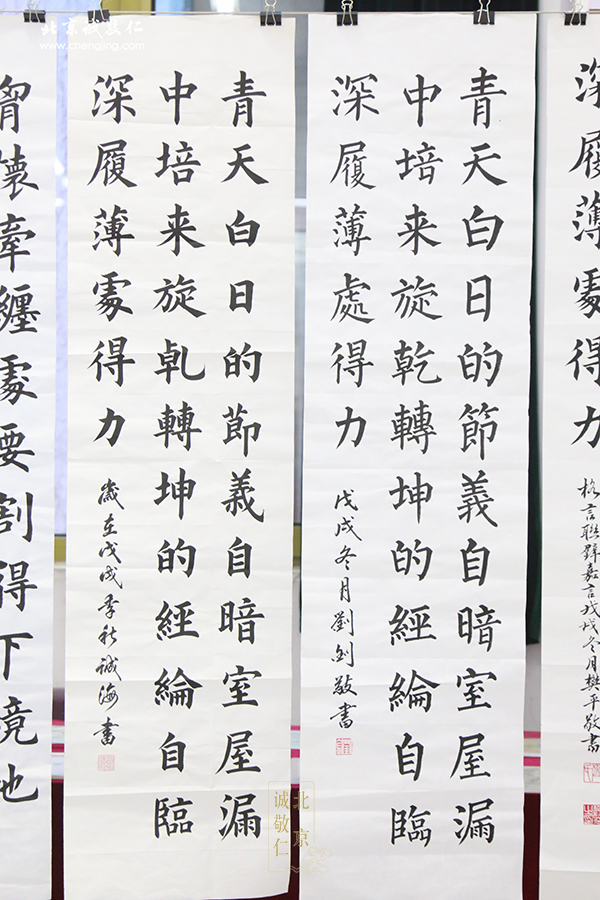 ▲ 少年組作品 仔細比對每位選手的筆觸,同樣一個字,不同風格的呈現。字里行間,映射出主人的做事風格甚至身材體格。 楊老師曾在教學心得中提到父親的教誨:“字掛在墻上,你的內在,完全讓人赤裸裸看得一清二楚,因為行家會看出你的內涵,看到你的修為有幾兩?!边@也是我們提倡習練正楷的原因,“字正”與“心正”,有著密不可分的關聯。 2018年12月31日,第五屆「誠敬杯」軟筆書法決賽,屬于書寫者的時刻即將到來,讓我們拭目以待!