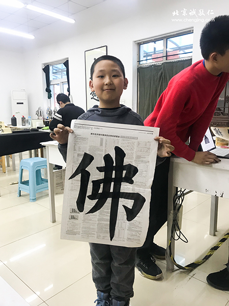 博成這天練的“佛”字,不好寫,橫的斜度,豎撇的弧度,懸針豎的粗細(xì),剛開始總是“撿了芝麻丟了西瓜”,但他每次都很樂呵很認(rèn)真地改正,來來回回一個(gè)下午,把各方面都掌握住,終于得到了老師的過關(guān)肯定。挑戰(zhàn)成功的他超開心:我終于過關(guān)啦!