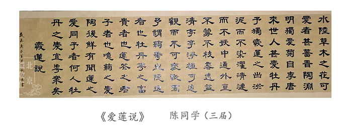 從靜中觀物動,向閑處看人忙,才得超塵脫俗的趣味;遇忙處會偷閑,處鬧中能取靜, 便是安身立命的工夫。 ——《菜根譚》 有幸的是,我們以筆墨作舟,一筆一筆出發,一程一程升華,能以此滋養安身立命的功夫。這次書法挑戰賽設定了半個月的期限,定好目標逐一完成,就會對時間很計較,否則永遠被手機、聊天刷得“沒時間”。 這中間也許會經歷一個很難熬、想放棄的過程,但相信堅持下來的同學都能體會到:隨著一次次挑戰、一步步長進,心眼手的功夫都會更上層樓,這種快樂無與倫比。繼續努力,作為楊老師親傳學生,你們一人學好,可以利益一省一地。 先來欣賞幾幅作品,更多精彩陸續上線 ~