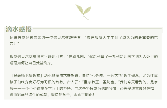 每周一次硬筆課,整整半年多的時(shí)間,家毅每一節(jié)課都堅(jiān)持下來了。不僅獲得了老師們的喜愛,家毅自己也愛上了「楊老師書法教室」和硬筆課程。