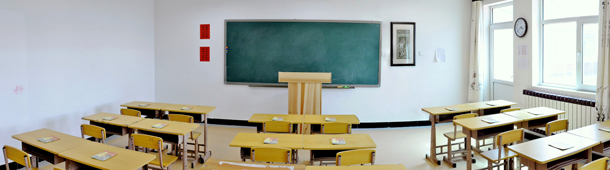 清靜而整潔的兒童書法學習區,位于高大的白樺樹旁。明亮的教室里,井井有條地擺放著可以調節高度的桌椅;
