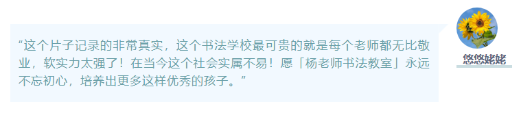 2020年11月19日,「楊老師書法教室」發(fā)布的一則視頻《推薦!好的學習氛圍 對孩子學前影響有多大》在家長群里引起了熱議,大家紛紛留言表達對「楊老師書法教室」教學的感受。其中有一則留言格外引人注目: