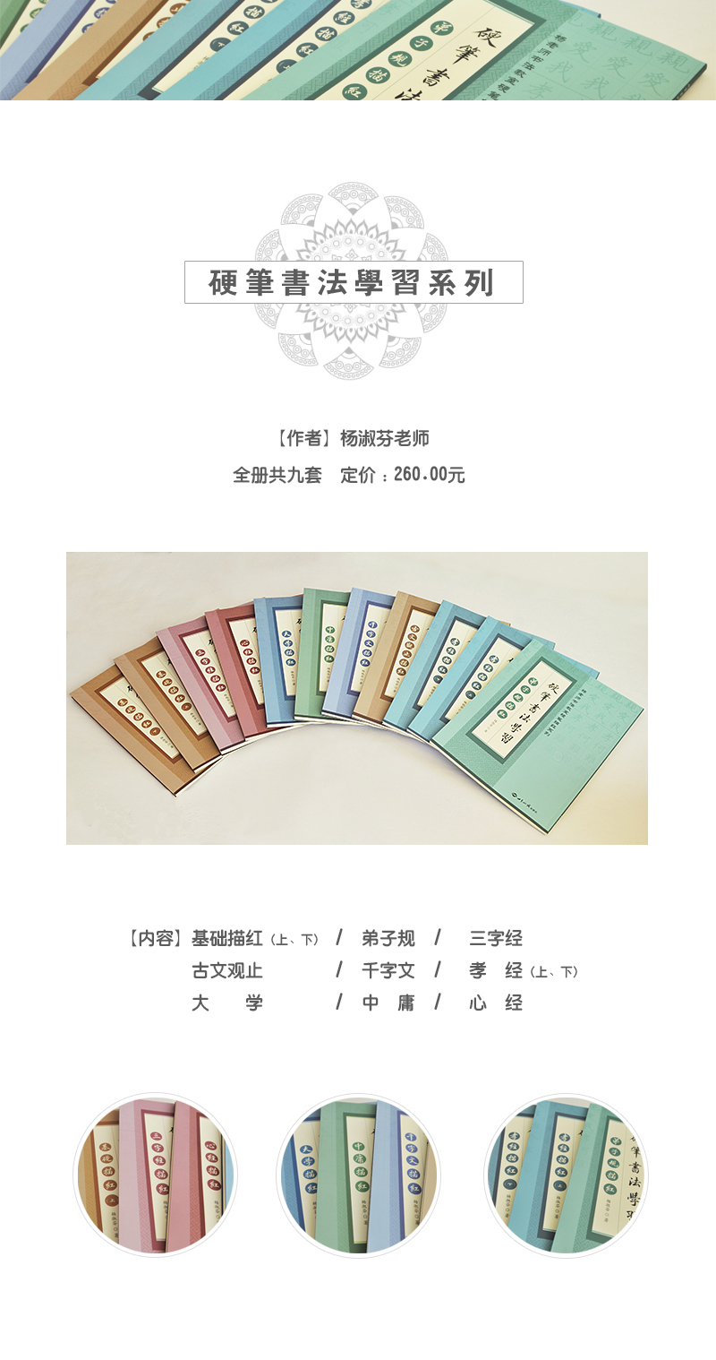 此系列描紅的編排,由基本筆畫開始,逐步進階到偏旁部首,以及偏旁部首的運用和字體的結構,并且將經典融入書法練習中,在練字的同時,還能接受國學經典的熏陶。在一筆一劃的描寫中漸漸讓身心獲得寧靜,從千百年流傳之經典中體會祖先的人生智慧。在那筆墨與心靈一點契合時,體會身心一片清涼。