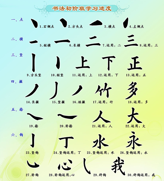 初階:可以掌握正確的執筆方式,學習用身體的力量放松書寫,掌握「永字八法」基本筆畫及基本字
