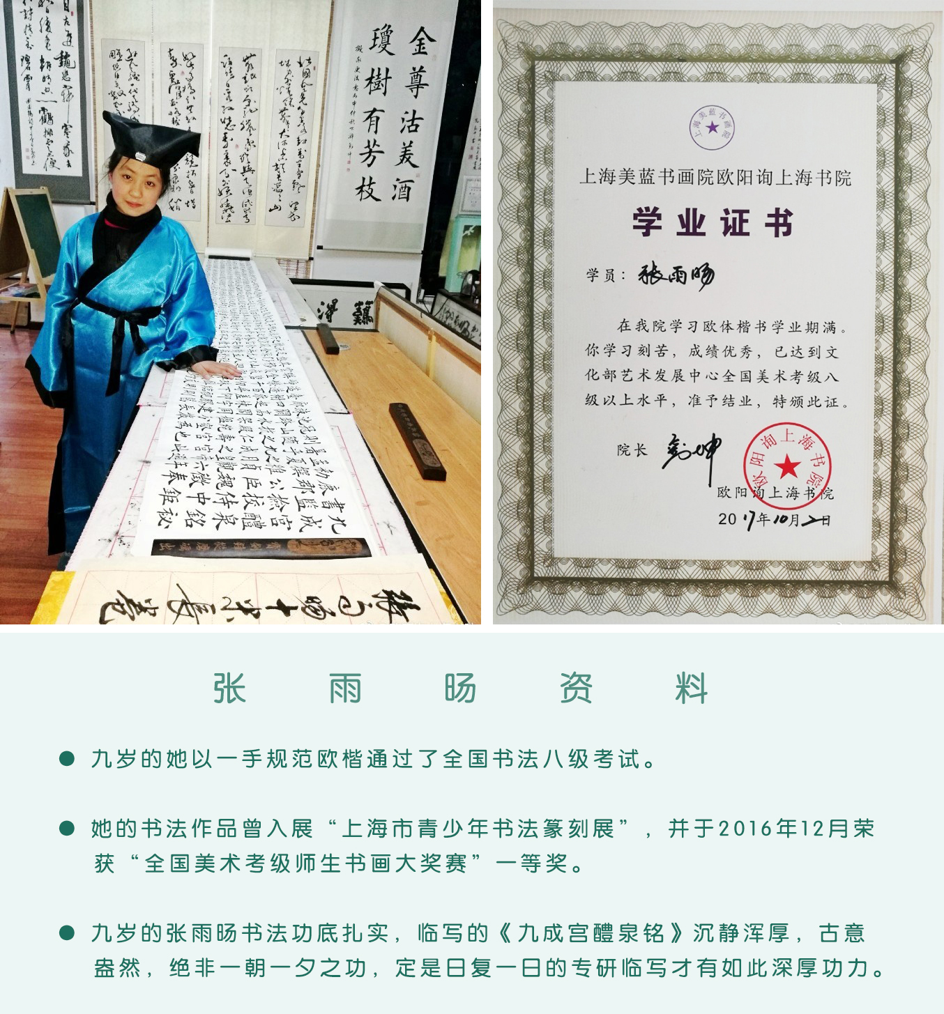 近日,在中國上海有位名叫張雨旸的小女孩兒,以其一手規(guī)范嚴謹?shù)臍W楷《九成宮醴泉銘》引起了網(wǎng)絡(luò)褒貶不一的熱議。