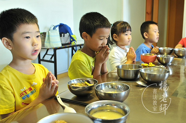 “陽陽,粥現在還有點燙,我們先放在一邊讓它涼著。現在我們先念餐前感恩詞。”