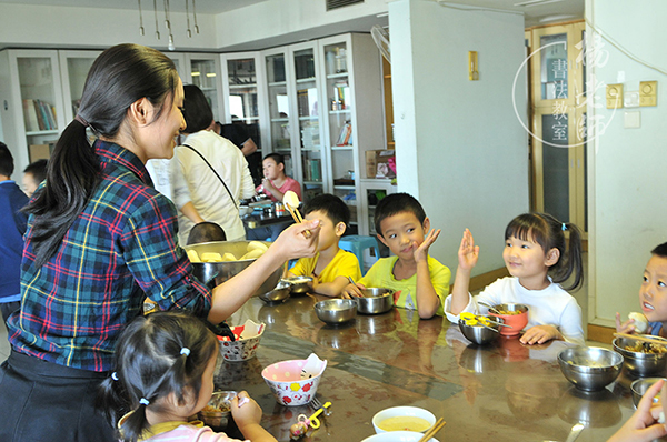 吃完蘆筍,陽陽把碗朝老師伸過去:“糖三角!”