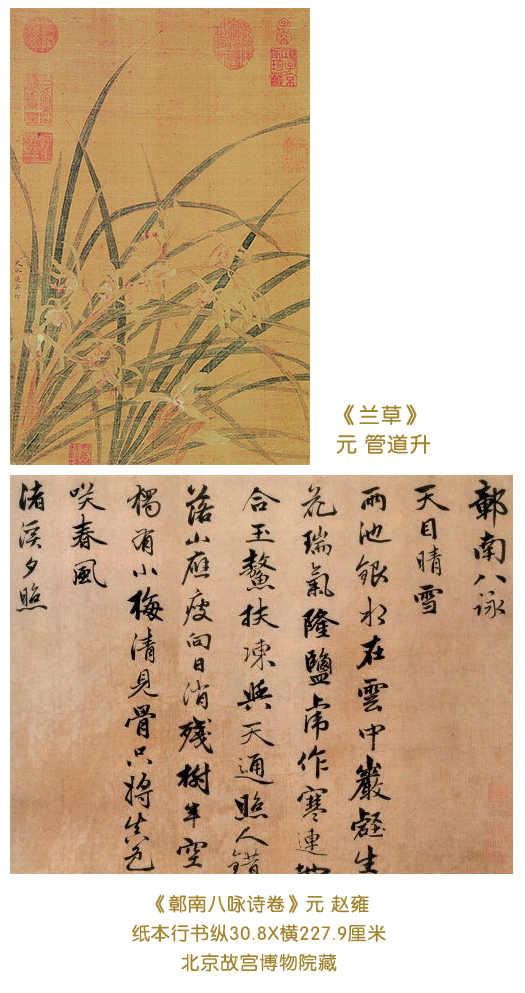 趙孟頫的二子趙雍、趙奕并以書(shū)畫(huà)知名,而其夫人管道升聰敏過(guò)人,能書(shū)善詞,繪畫(huà)精于墨竹、梅、蘭,筆意精絕。元仁宗曾取管道升的書(shū)法,與趙孟頫及其次子趙雍的書(shū)法用玉軸精裝,鈐上御印藏于秘書(shū)監(jiān),說(shuō):“讓后世知道我朝有一家的夫婦父子都善書(shū),這也是奇事啊!”