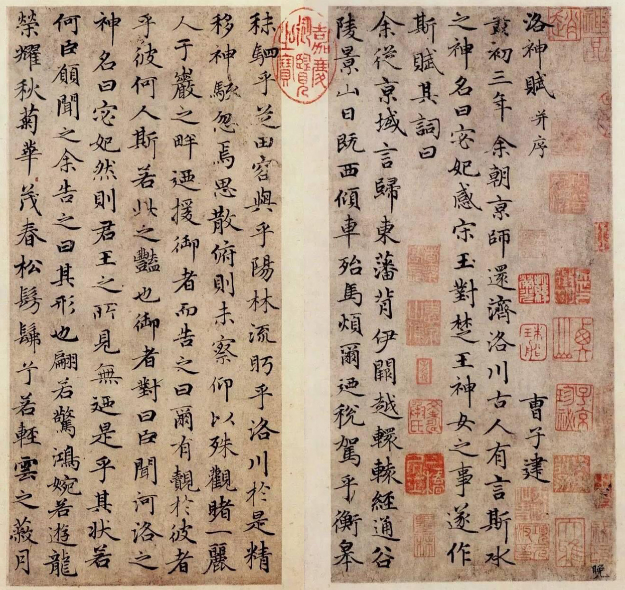 趙孟頫的傳世書(shū)跡較多,有《洛神賦》、《道德經(jīng)》、《膽巴碑》、《玄妙觀(guān)重修三門(mén)記》、《臨黃庭經(jīng)》、獨(dú)孤本《蘭亭十一跋》、《四體千字文》等。傳世畫(huà)跡有大德七年(1303年)作《重江疊嶂圖》卷、元貞元年(1295年)作《鵲華秋色》卷,圖錄于《故宮名畫(huà)三百種》;皇慶元年(1312年)作《秋郊飲馬》卷,現(xiàn)藏故宮博物院。