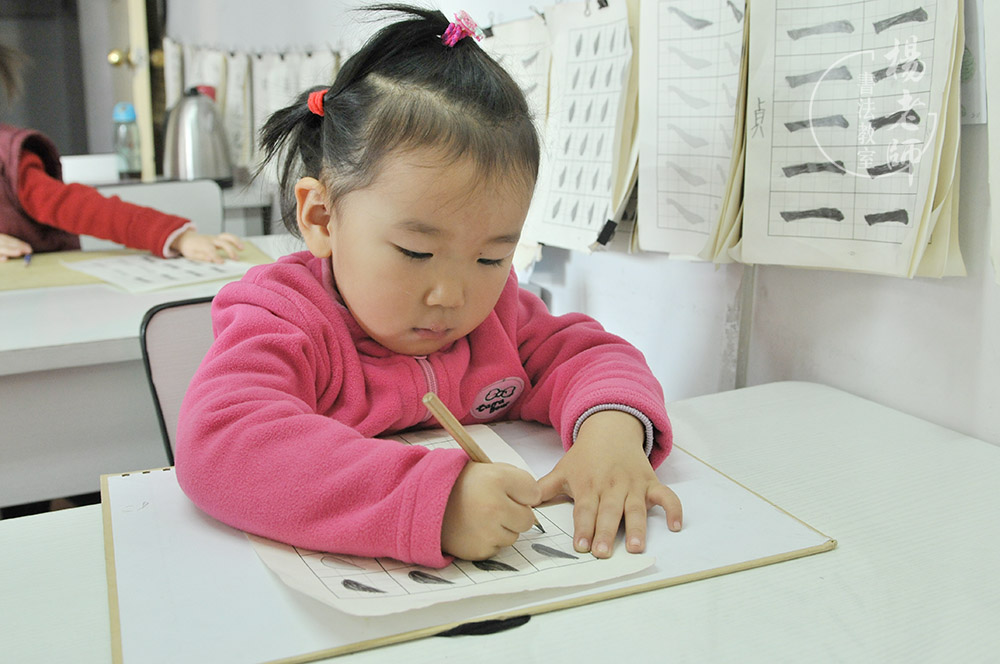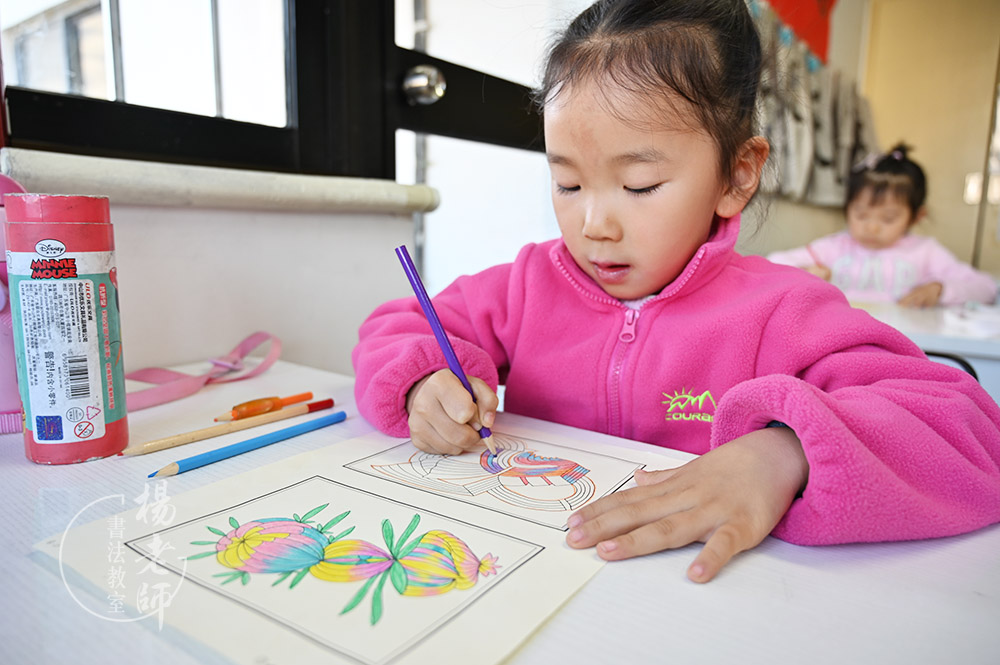 在這里,老師們教孩子靜心專注。教室開設有描紅和彩繪課,讓一凡在簡單的課程里增長了控筆能力,在填色過程中認知顏色,在色彩斑斕的世界里變得投入和專注。而心無旁騖、靜心專注是學習和工作做好的很關鍵要素,相信書法教室給予的定心能量會在將來很好地幫助一凡。