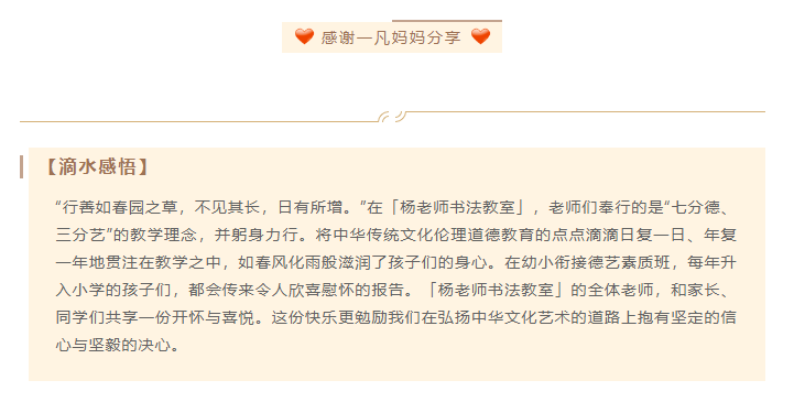 在給一凡選擇幼兒園時,一次偶然的相遇讓我們和「楊老師書法教室」結緣。而來到書法教室試讀當天,看到樸素的教室墻上孩子們一張張端莊有力的大字,感受著老師們的和善謙恭,我們就決定了選擇這里的幼小銜接德藝素質全日班。