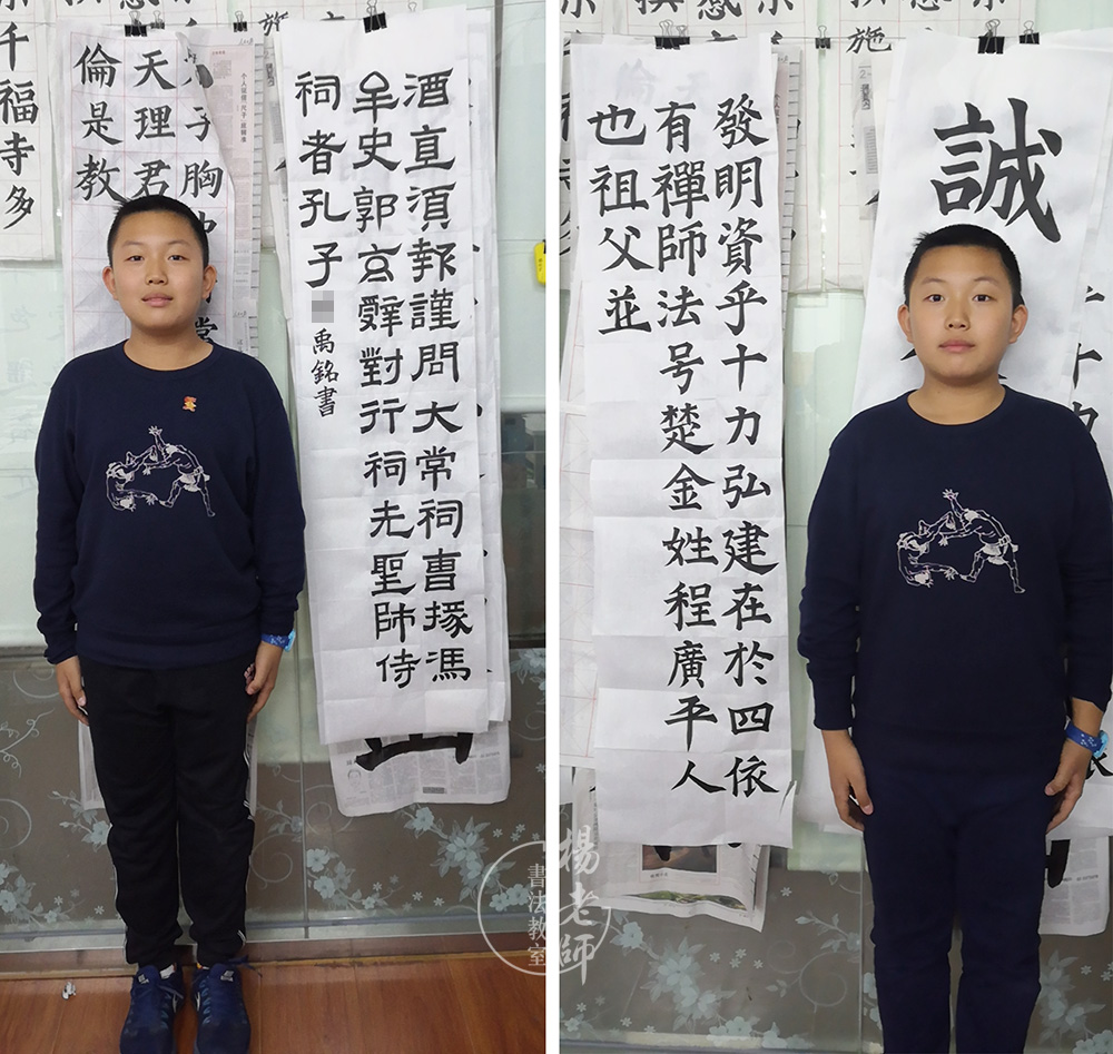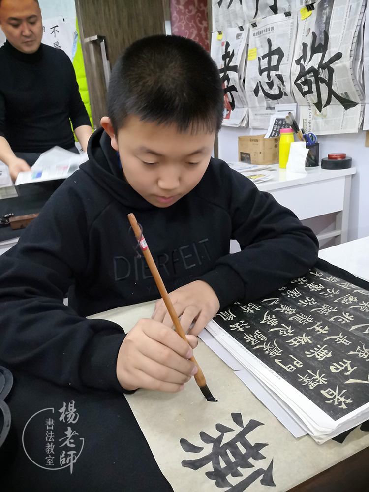 禹銘是在即將上小學三年級之前的暑期開始學習書法。那時,「楊老師書法教室」海淀分校區剛開張,禹銘是第一個進教室學習的學生。他給人的印象是比較實干、努力。每節課他都很珍惜,非常注意保持正確的站姿和書寫姿勢,因為認真全神貫注投入,經常會寫到滿頭大汗。