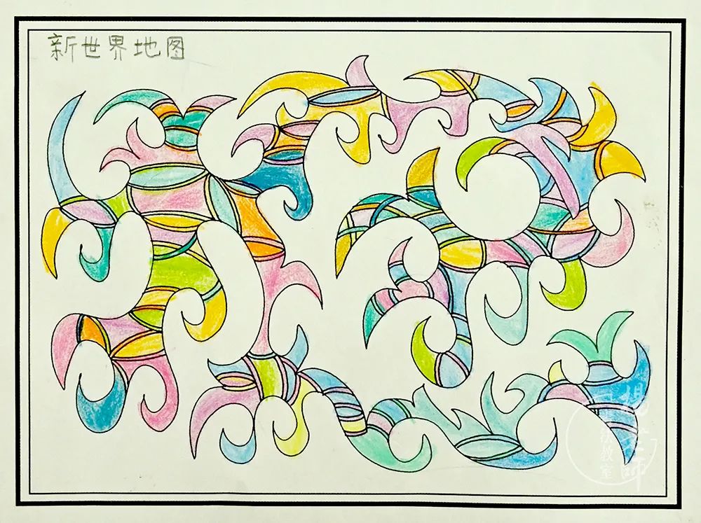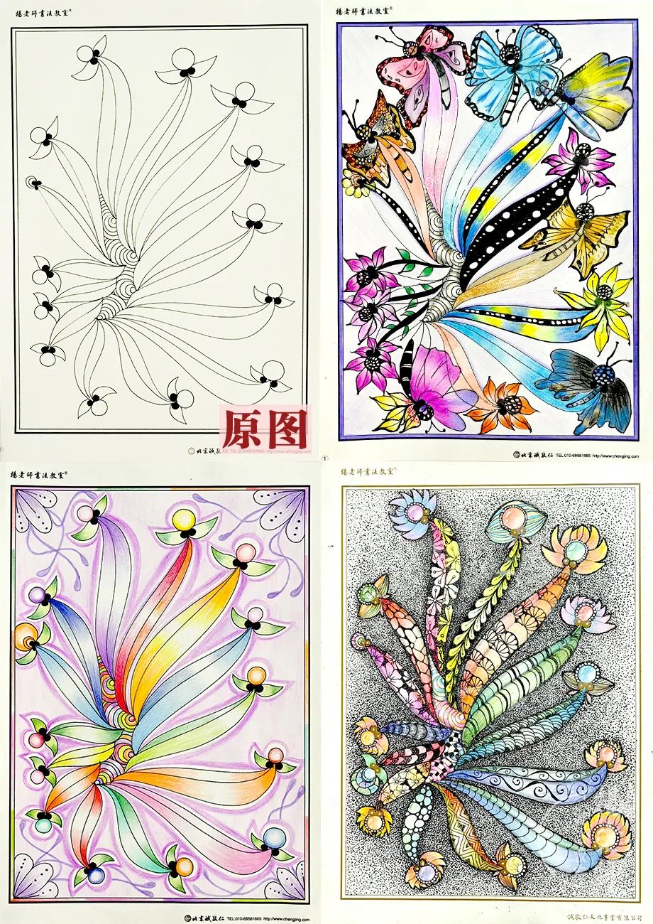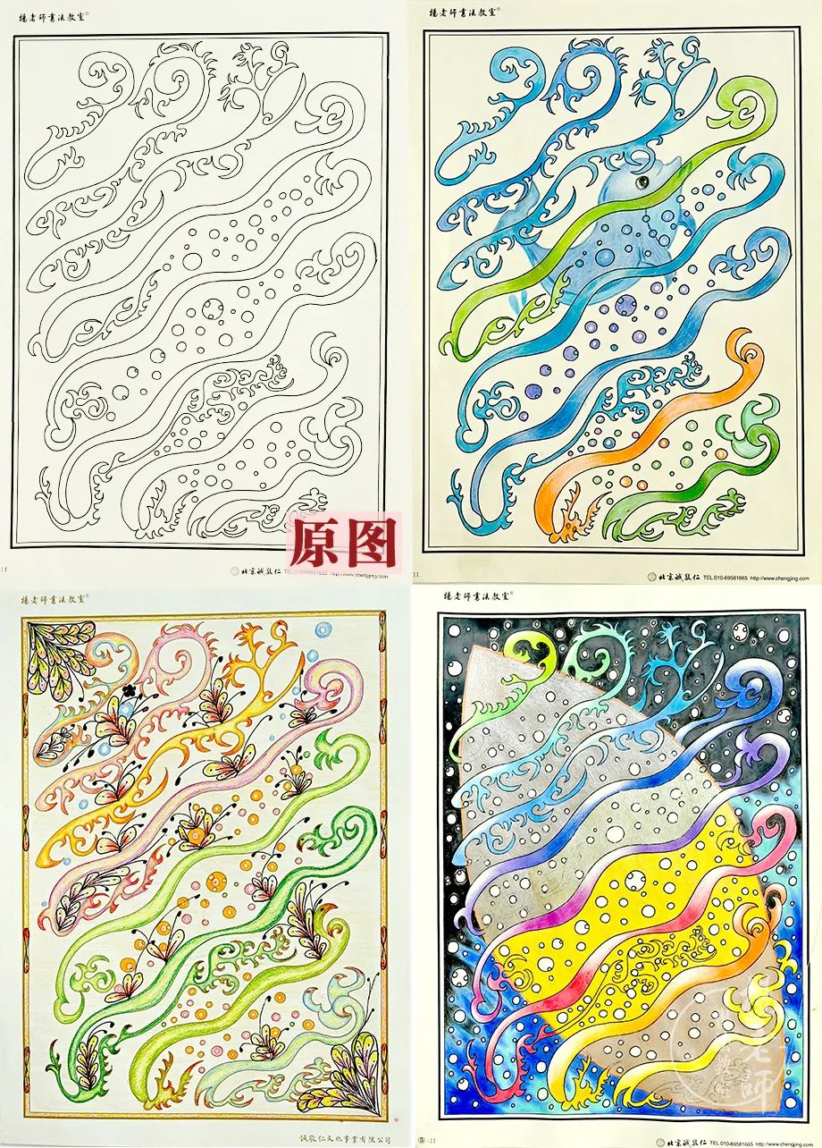 對(duì)于六歲以上至成人,可以任其打開奇思妙想之門,不拘泥于現(xiàn)有的圖形,重組出新的圖案,同樣一幅圖,每個(gè)人的彩繪風(fēng)格迥異、別具一格!