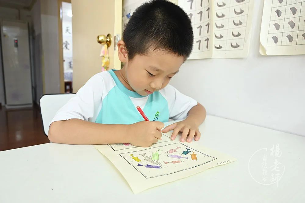 &當(dāng)桐桐完完全全對(duì)彩繪產(chǎn)生興趣,并投入進(jìn)去的時(shí)候,老師就無(wú)須在旁再做指導(dǎo),這個(gè)時(shí)候他已具備了獨(dú)立思考,分析圖案的能力,自行配色組合。無(wú)論是在書法教室或在家,都可以獨(dú)立完成一幅色彩明艷、線條均勻、頁(yè)面整潔的彩繪作品。媽媽曾笑著跟老師說:桐桐一次在家彩繪,彩到停不下來,不收手的程度。