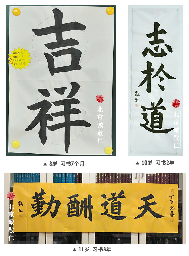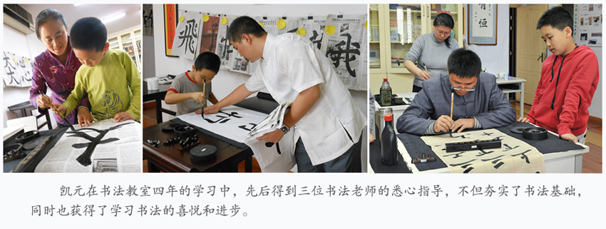凱元對書法的興趣始于小學一年級。那時,學校有寫字課, 用的是鉛筆。有一次,寫字課老師給孩子們播放了一部關于王羲之學書法的動畫片。凱元回家就說他也要學書法。我和他爸爸聽了都很高興,因為我們早就有意讓他學書法。但是一直希望他是出于自己的興趣去學,而不是因為爸爸媽媽想讓他學。所以并沒有急著給他報班。