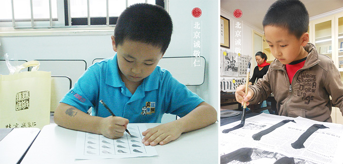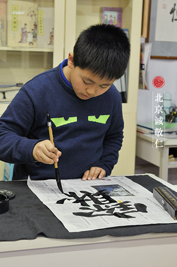 他提出要學書法之后,我們也沒立刻給他報班,因為我們希望他學什么都能夠持之以恒,不是一時興起,說放棄就放棄。于是,我們讓他仔細想清楚,決定學就一定得堅持。此后,每每聊到書法,凱元都說要學。2012年九月底,「楊老師書法教室」在我家樓上開班五個月之后,凱元終于如愿以償,開始了書法學習。