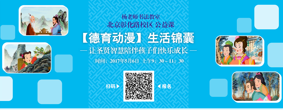 2017年5月6日,北京誠敬仁德育教育家楊淑芬老師,將在「楊老師書法教室」彰化路校區,為廣大師生以及家長們開講一場別開生面的公益課——《德育動漫——生活錦囊》,以期通過老師多年來對德育動漫監制過程中的體會,以及德育動漫教學課程的豐富經驗,引導家長和孩子們,善學善用德育動漫這一難能可貴的教育資源,讓德育動漫成為和諧家庭的領航燈和保護傘。