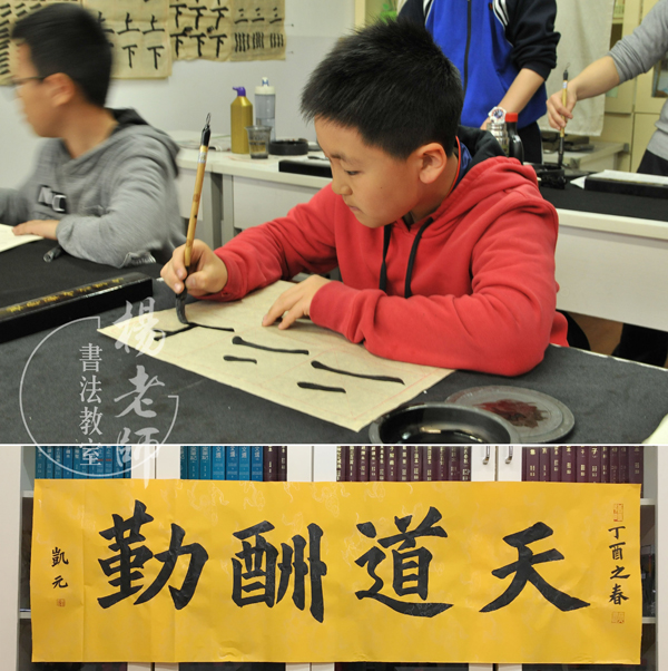 鄭同學(xué)因書法代表學(xué)校出訪阿聯(lián)酋,現(xiàn)場寫出了「福」字,并用英語解釋「?!沟暮x,得到「?!棺值膶W(xué)生非常地高興。他回校后因?qū)W業(yè)原因,書法擱置了一段時間,但因功底扎實,功力并未大減,再拿起筆后沒多久就寫出了「天道酬勤」掛在了教室,成為全班的座右銘。