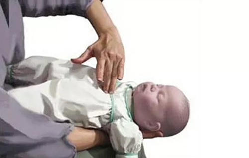 2.以兩手的中指或食指,放在寶寶胸廓下和肚臍上的腹部,快速向上重?fù)魤浩龋茌p柔;
