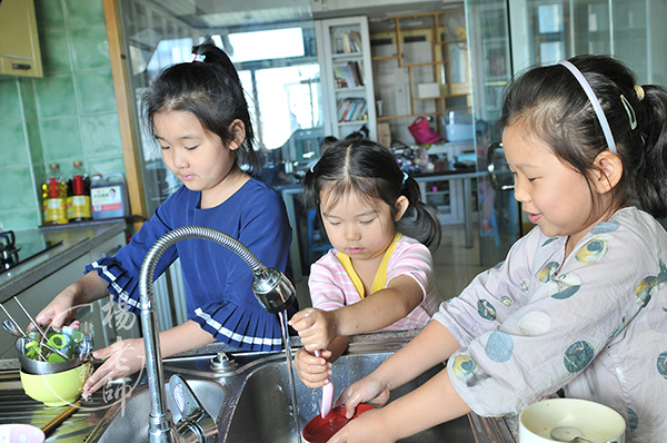 二十分鐘左右,孩子們陸續(xù)用完餐,離座前,老師引導(dǎo)孩子們將餐桌上的殘?jiān)湃胪胫性匐x座。下位后,孩子們向仍在用餐的老師、同學(xué)鞠躬道:“我吃飽了,大家請慢用。”接著緩緩地走到廚房洗碗。老師時(shí)常叮囑孩子們:“珍惜水資源,做節(jié)水寶寶”,因此孩子們開水龍頭時(shí)會(huì)有意識地調(diào)節(jié)水流,不敢浪費(fèi)。在老師的帶領(lǐng)下,孩子們每天都會(huì)溫習(xí)洗碗的步驟,直到生活好習(xí)慣內(nèi)化為他們生命中不可或缺的一部分。