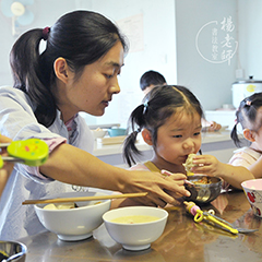 有孩子吃飯聲音太響,老師教導(dǎo)孩子改正用餐方法,不用力啜飲湯汁,而是用勺送湯入口,自然而又無傷大雅。
