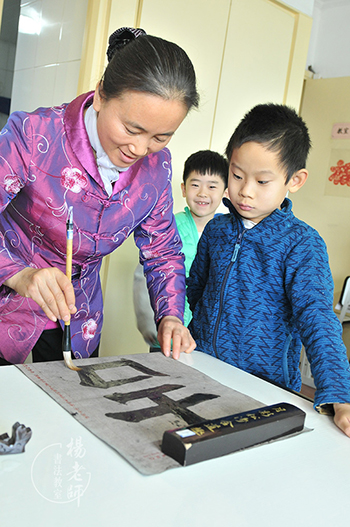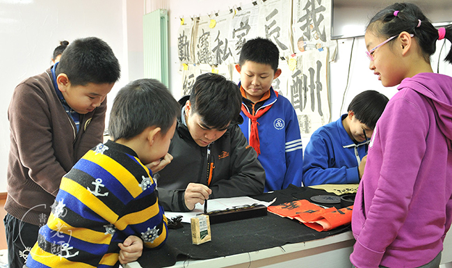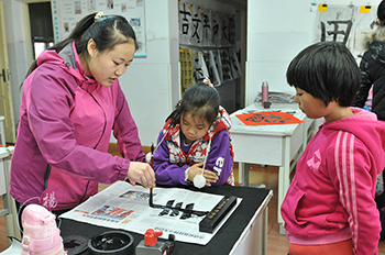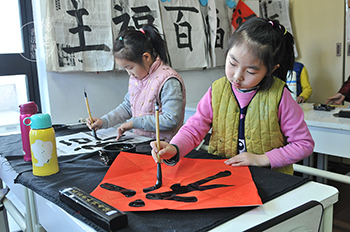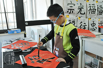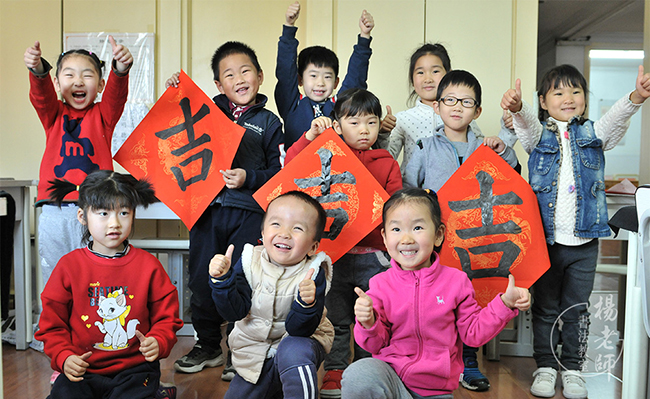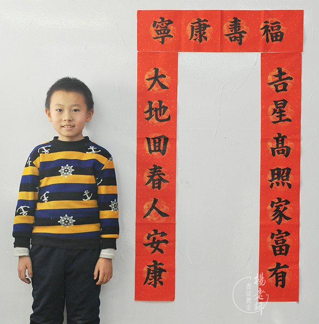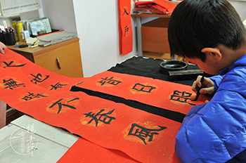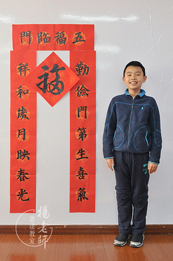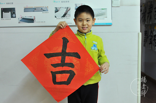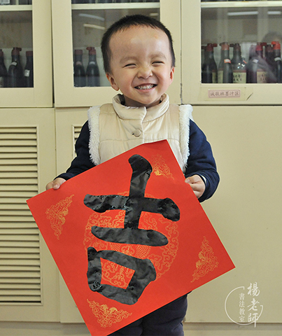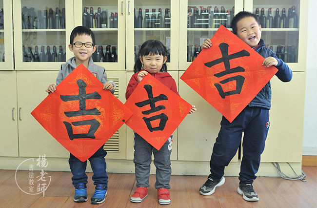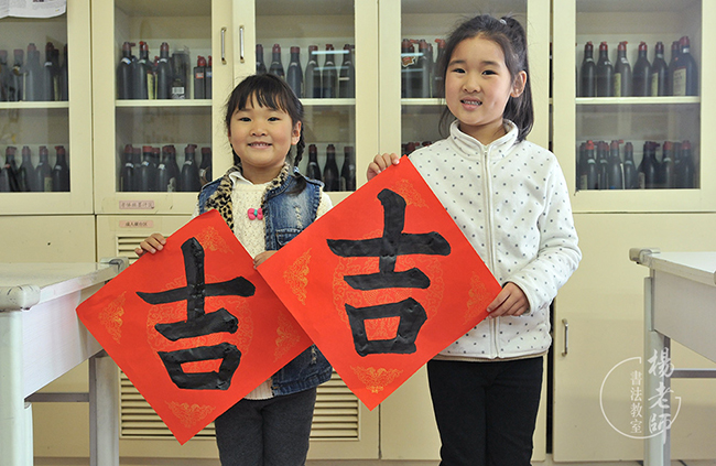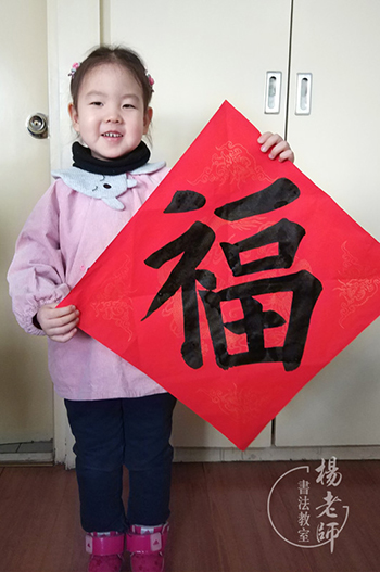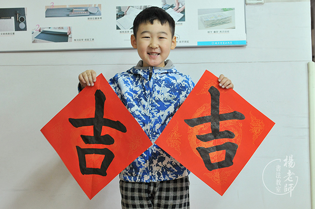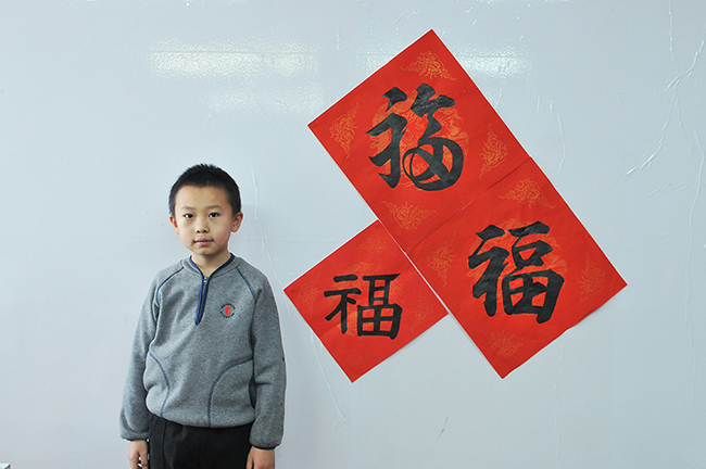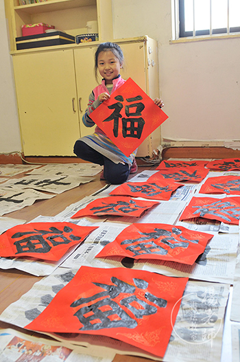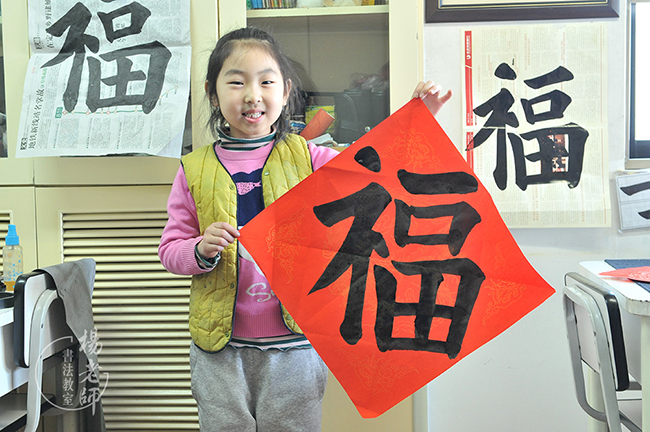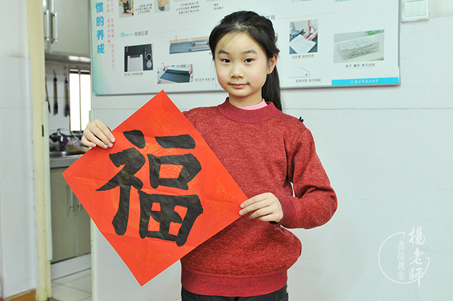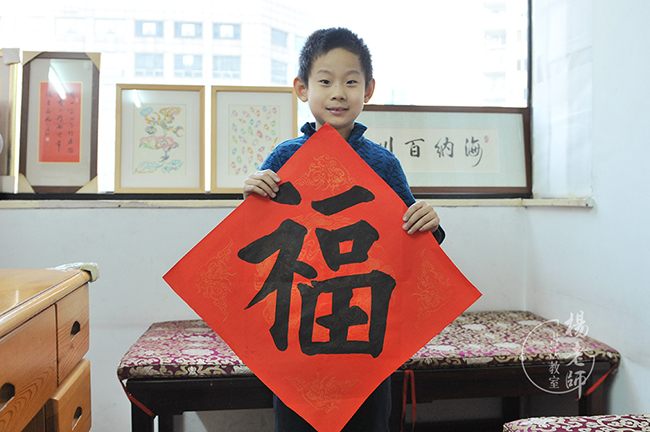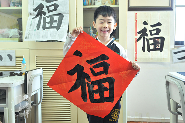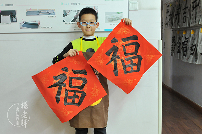 孩子們卯足了勁,將積淀了一年的功力書寫于紅紙上,毛筆在充滿專注與力量的小手下,呈現出一張張渾厚圓潤的「福」字。