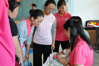 這時,可愛的小混血兒跑過來抱著李老師的大腿,大眼睛一閃一閃地看著李老師,李老師輕輕彎下身子把他抱起來,小家伙高興得哈哈大笑。院長告訴我們,他們的年紀(jì)不算最小,還有一個才一個多月就被拋棄了的嬰兒。院長把我們帶到一個房間,里面擺放著好幾張嬰兒床,順著院長手指的方向,我們看到一個小小的身子正靜靜地睡在嬰兒床上,時不時皺起小眉頭,努起小嘴,像是夢里不高興了。為了不吵醒小寶寶,我們只是靜靜地在旁邊祝福她一生平安健康。這時,孔老師抱著一個很可愛的小寶寶走過來,院長說她是由于心肺功能不全而被遺棄的,叫眉眉。小眉眉長得很清秀,孔老師抱著眉眉走到戶外,讓眉眉看一看盛開的鮮花,曬一曬太陽,小眉眉似乎感覺挺舒服,閉起小眼睛睡了起來。戶外還有幾位老人在曬太陽,看見我們都笑著豎起大拇指。有幾位老師輕輕走到老人身邊陪他們聊天說話,時不時會傳來一陣爽朗的笑聲。