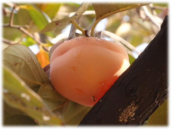 走在樹下,不時有樹葉和著沙沙的聲響,徐徐的飄落在我的腳邊,像是歡迎我的到來,又像是要特別提醒我的注意。我微微的笑著,抬頭仰望滿枝的柿子,瞬間想變身畫家,靜坐于旁邊的圓木長凳,鋪開畫板,美美的畫它一天。將那如布的藍天,暖暖的紅日和這金色的柿子,一并畫入這其間。