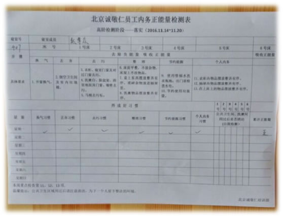 下面這張表是自我檢測表,除了生活老師抽檢內務外,自己給自己評分,對比看哪些做到了,哪些沒有做到。