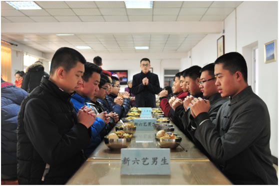 早晨7點半早餐時,新六藝班的同學們,在餐前集體大聲念誦餐前感恩詞:感恩國家培養護佑,感恩老師悉心培養,感恩農夫辛勤耕種,感恩食物給我們營養,感恩天地萬物及一切付出的人,我們生活在感恩的世界里,祝大家用餐愉快!在朗朗的餐前感恩詞結束后,同學們才開始就餐。