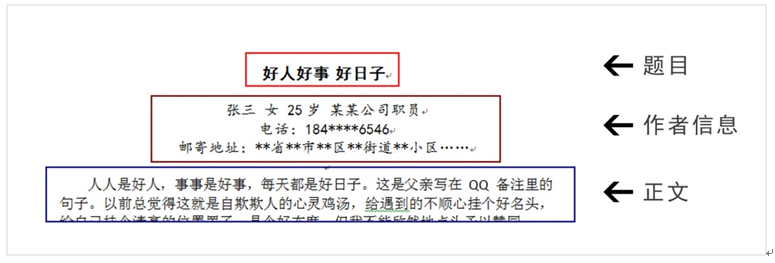 5. 題目下方用楷體四號標注:作者姓名、性別、年齡、工作單位或學校年級、聯系電話和通信地址(有關獎品寄送)
