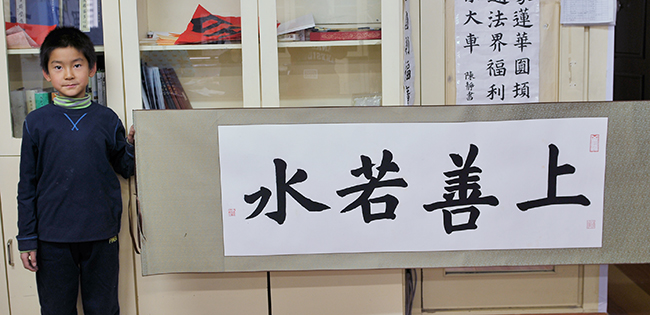 2. 書法的學習首重基本功, 這是一個循序漸進,慢慢熏習的過程。書法的學習首重基本功,也即基本筆畫的練習越扎實,往后的進步就會越快,一開始好似比別人慢一些,但是兩三年后就能,基本功扎實的同學,他們寫出的字是有區別的,尤其在字的力道方面,基本功扎實的同學,寫出的字會比較耐看。比如孟凡竣,孫米陽、嚴子恒,彭欣祺等,他們幾位同學是從幼兒班扎根,2015年10月份后才升級到誠敬班的,孫米陽同學是2016年1月升級到誠敬班的,這幾位同學因為在小班有過至少一年的時間學習,不論是禮儀還是書寫的規矩和基本功都比較扎實。